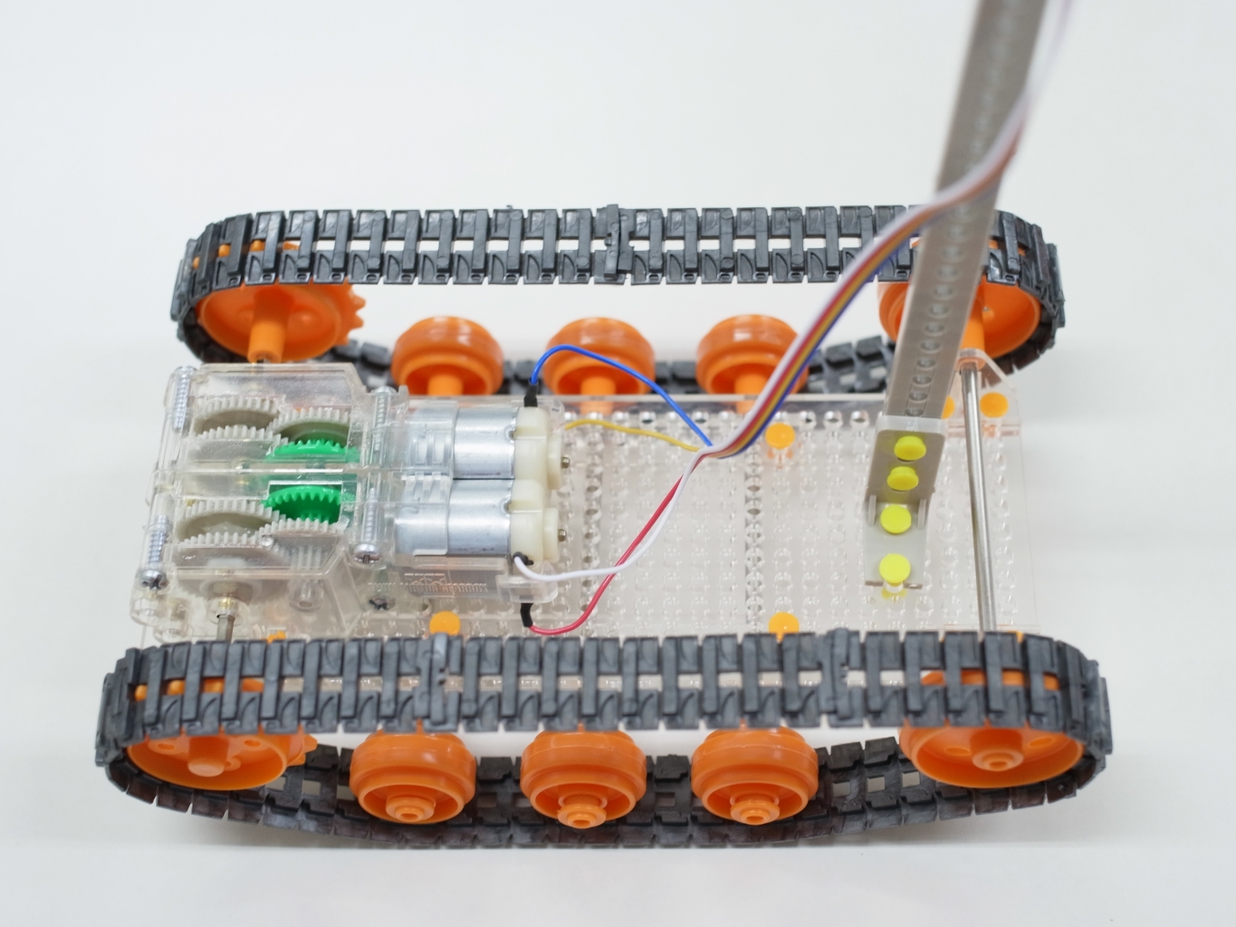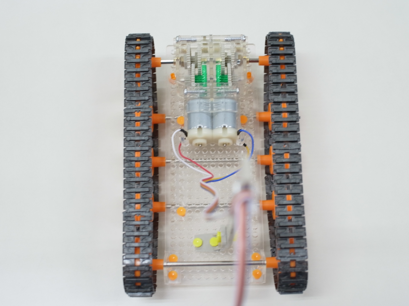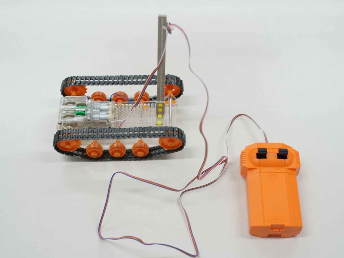 身近な自動車とはまったく違う動きをするロボットの回転を、生徒たちにもっと理解してもらうために教室にあった工作キットを使ってキャタピラ車のリモコンを作ってみました。